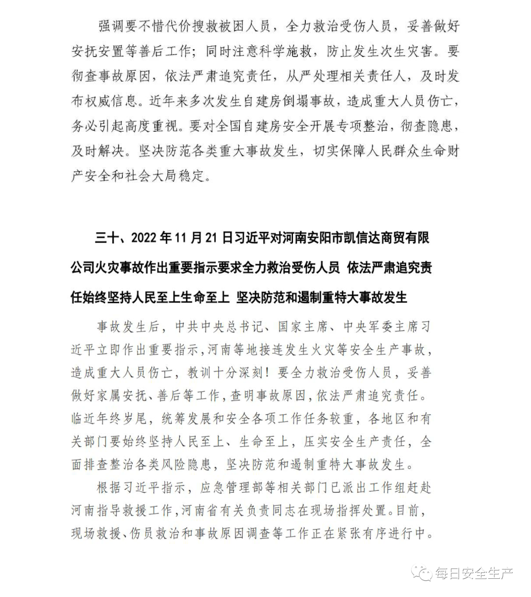 事故發(fā)生后,中共中央總書記、國(guó)家主席、中央軍委主席習(xí)近平立即作出重要指示,河南等地接連發(fā)生火災(zāi)等安全生產(chǎn)事故,造成重大人員傷亡,教訓(xùn)十分深刻!要全力救治受傷人員,妥善做好家屬安撫、善后等工作,查明事故原因,依法嚴(yán)肅追究責(zé)任。臨近年終歲尾,統(tǒng)籌發(fā)展和安全各項(xiàng)工作任務(wù)較重,各地區(qū)和有關(guān)部門要始終堅(jiān)持人民至上、生命至上,壓實(shí)安全生產(chǎn)責(zé)任,全面排查整治各類風(fēng)險(xiǎn)隱患,堅(jiān)決防范和遏制重特大事故發(fā)生。